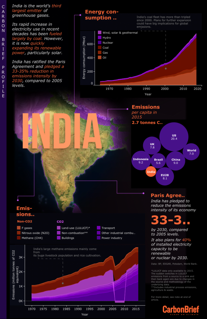 भारत ने नवीकरणीय ऊर्जा को बढ़ावा देने के लिए 2003 में अपने बिजली संबंधी कानून का इस्तेमाल करना शुरू किया. 2015 में भारत ने नया लक्ष्य निर्धारित करते हुए 2022 तक 175GW की नवीकरणीय ऊर्जा की स्थापना का लक्ष्य रखा, जिसमें 100GW सौर, 60GW अपटीय पवन, 10GW बायो-एनर्जी और 5GW छोटे हाइड्रो परियोजनाओं का शुमार है. कार्बन ब्रीफ़ द्वारा पिछले साल लिखे गए एक विशेष लेख के मुताबिक, इस सबसे तकरीबन 70GW कोयले को रीप्लेस किया जा सकता है. पारंपरिक ईंधन और लो-कार्बन प्लांट्स को मिलाकर भारत की मौजूदा क्षमता 350GW है.