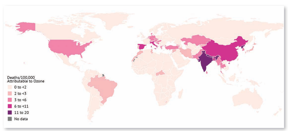 Global map of age-standardised rates of death attributable to ozone in 2021. Nearly 50% of the total ozone-related deaths occurred in India