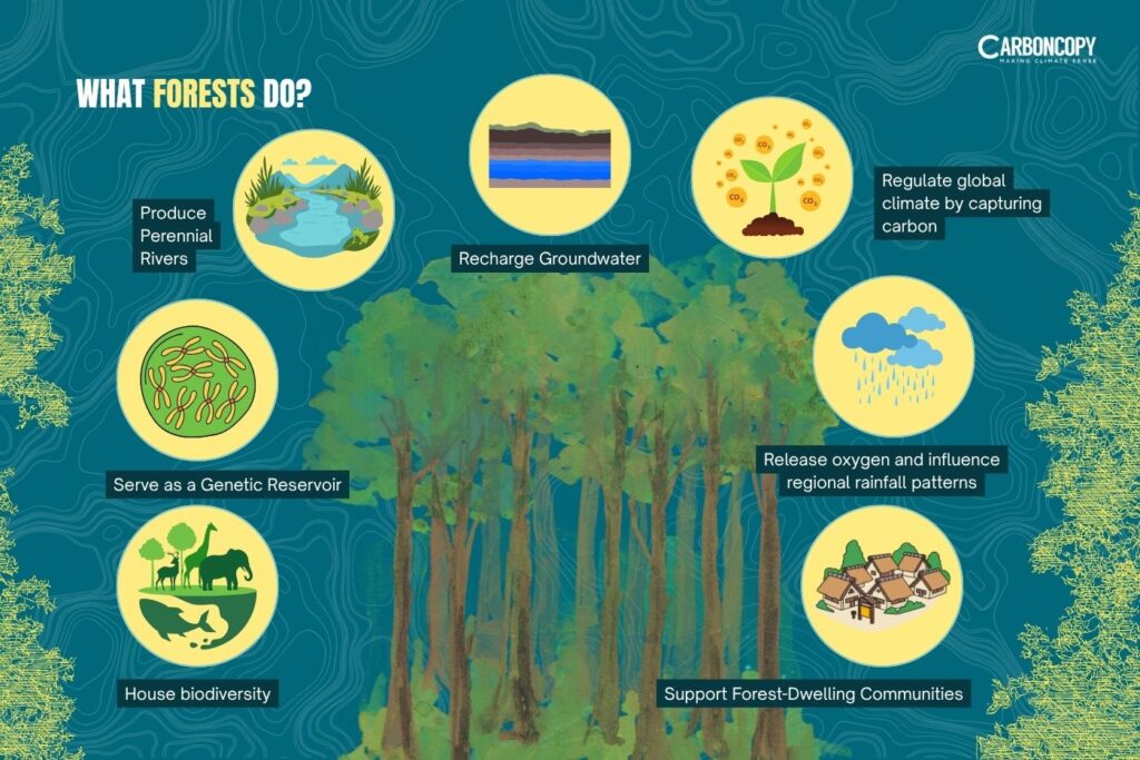 And yet, a collection of trees is not a forest. Evolving over millions of years, forests are complex ecosystems. Each comes with an unique assemblage of species — trees, ferns, animals, birds, insects, fungi and microbes — living off each other such that, as Barbara Kingsolver wrote in The Poisonwood Bible, the “forest eats itself and lives forever”. Apart from keeping the forest steady, as the box below shows, this latticework of species also stabilises global climate.