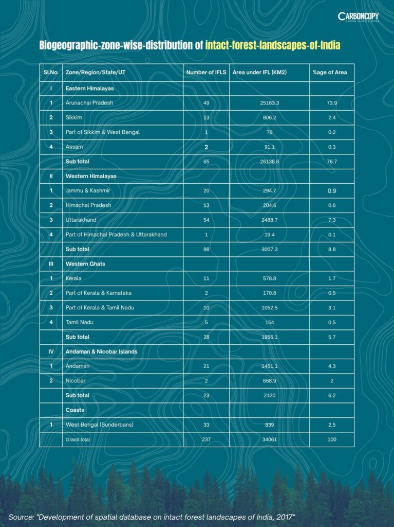 Given that regeneration is not counted while measuring intact forest ecosystems — WRI’s methodology, for instance, assumes that once lost, intactness cannot be regained — India needs to ask itself a very urgent question. If, by 2016, intact forest ecosystems covered no more than 1% of the country’s geographical area, what is that number today? Even taking a more expansive definition for forest cover, as inviolable areas are hard to come by in a country like India where millions depend on forest produce, forest patches (including plantations, though) bigger than 1,000 square kilometres covered just 14% of India’s geographical area by 2017. How much of India do they cover now? CarbonCopy posed this question to both FSI and NRSC. This article will be updated when they respond.