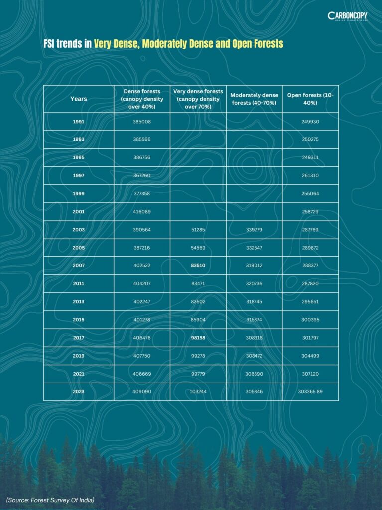 Thereafter, it has leveraged this (re)definition by not classifying forests by type (say, tropical evergreens or semi-evergreens) but by density (very dense, moderately dense and open). The fallouts are consequential. Even when the natural forest is cut and replaced by plantations, the focus on density lets FSI continue counting the land as a forest, alluding, at the most, to a change in forest density. See the chart below.