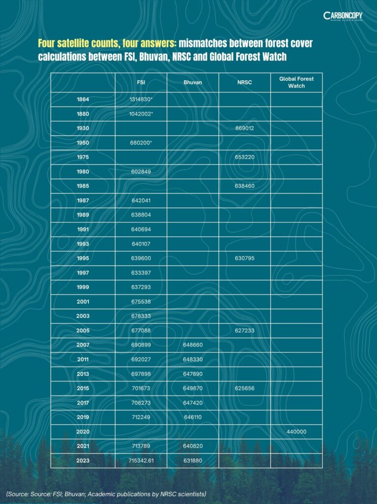 CarbonCopy has written to the FSI asking it to comment on the contradiction between its numbers and those of NRSC and Global Forest Watch. This article will be updated when they respond. For now, though, even the Bhuvan and Global Forest Watch numbers constitute an upper range on what India’s natural forest cover might be.