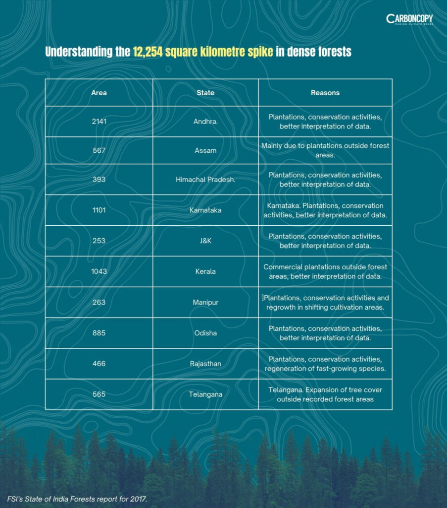 Going by the FSI’s numbers, very dense forests jumped discontinuously twice. First in 2007, mainly due to a change in mapping scale from 1:250,000 (25ha) to 1:50,000 (1ha), which permitted “the inclusion of smaller patches of forest cover up to 1 ha”. Then comes the jump in 2017 when land under dense forests spikes by nearly-13,000 square kilometres. While explaining that, FSI’s report lists plantations.