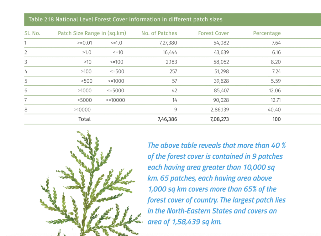 In other words, between 2015 and 2017, forest patches bigger than 1,000 square kilometres covered 461,574 square kilometres of India’s geographical area (14% forest cover, in essence). Even this number, however, is an over-estimate. The FSI, as data shows, mixes up plantation and forest numbers.