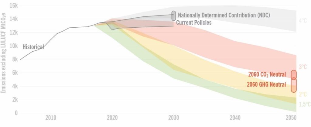 Analysts have long believed that decarbonisation efforts will hinge on when China plans to peak its emissions, and at what levels. While China has committed to reaching peak emissions before 2030, a recent study published by the Asia Society Policy Institute and Climate Analytics suggests that the peak will have to be attained much sooner, and no later than 2025, in order for China to meet its NDCs.