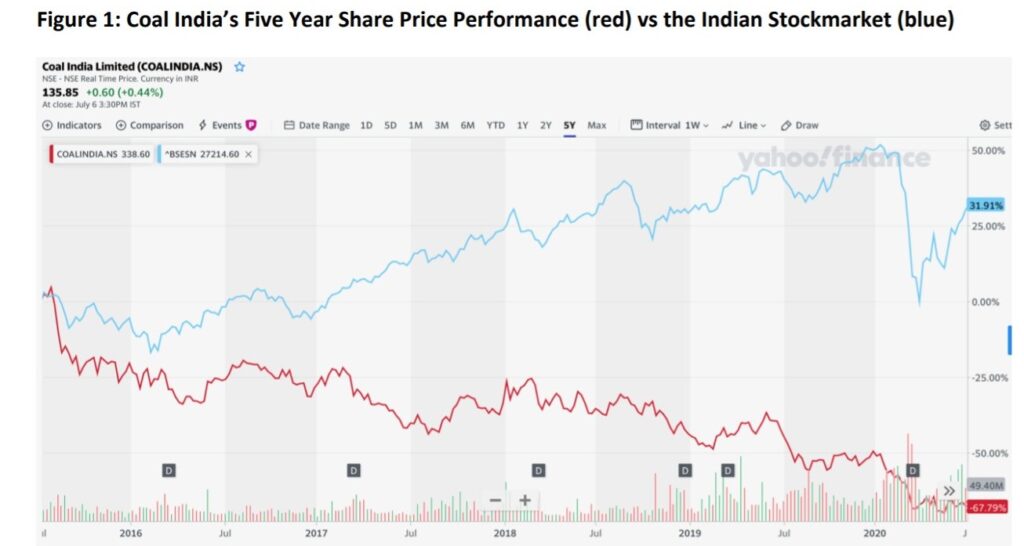 Despite the seemingly comfortable position of Coal India, climate transition risk exists in a significant way. In fact, it appears it has been partially factored into how the financial markets are perceiving Coal India over time. As evident from the chart below, despite a steady growth in the market itself over the last five years, Coal India’s stock market valuation has seen progressive, ongoing, and serious erosion.