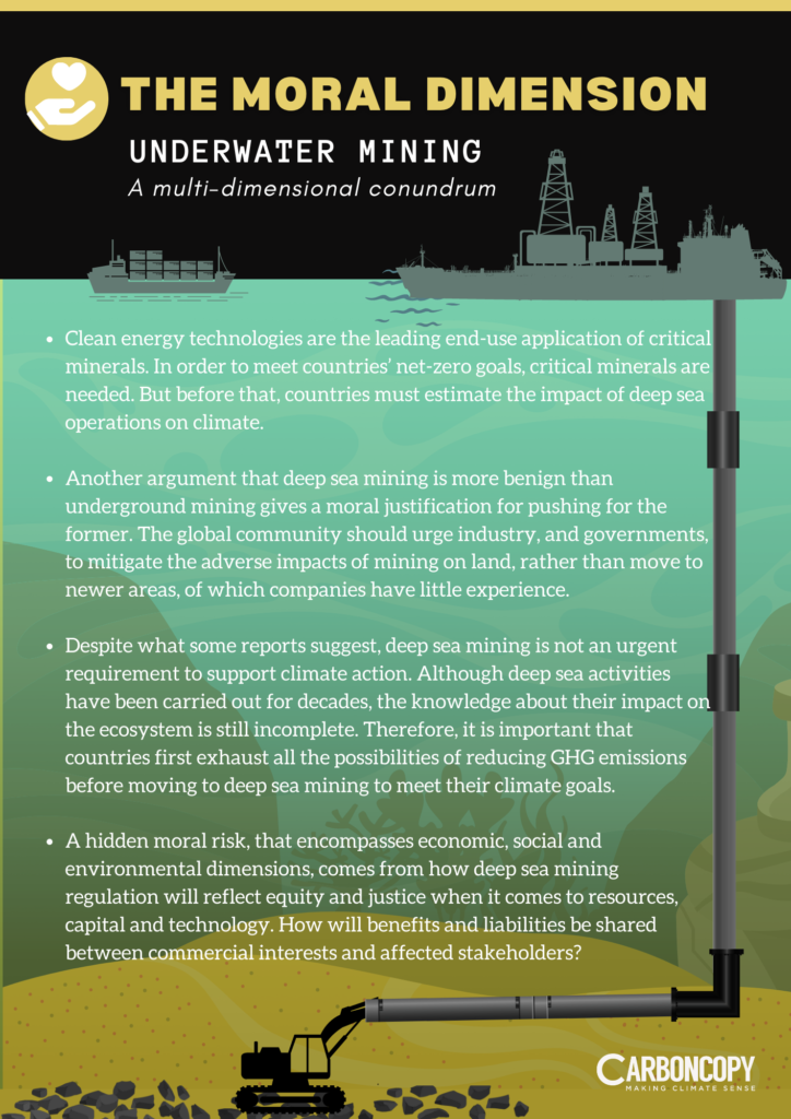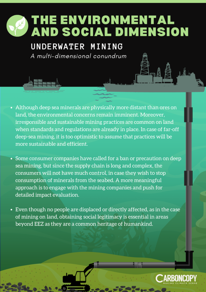 Scientific community and civil society have raised concerns over the multitudinal risks and irreversible impacts of deep sea mining on marine ecosystem and biodiversity. But with the intersection of energy security, resource-independence and climate mitigation coming into sharp focus over the past few years, support for deep sea mining has grown stronger. One of the main supporting arguments is that mining critical minerals from the ocean floor will have a smaller environmental impact than mining them in tropical rainforests. Deep sea nodules are also claimed to have higher concentrations of minerals than terrestrial ores. Nevertheless, deep sea mining carries inherent risks to marine biodiversity, and neither the experience nor the standards exist to minimise impacts.