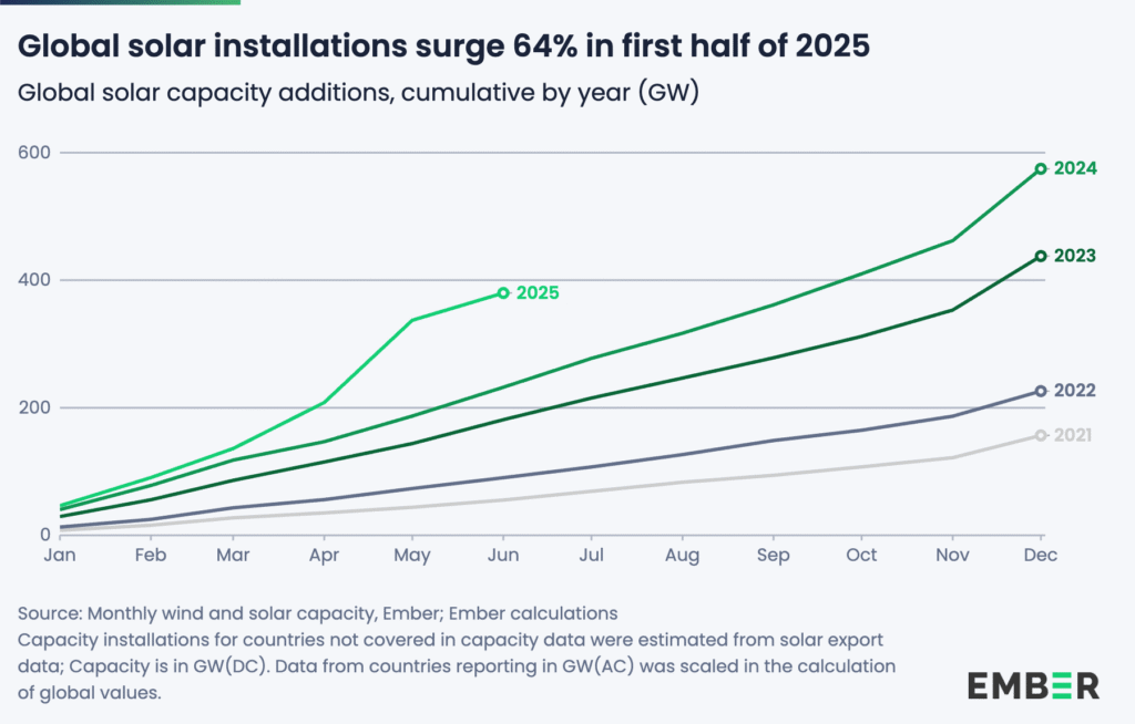 Between January and June this year, the world added 380 GW of new solar capacity — a global record, according to data by the London-based think tank Ember. The solar addition was 64% higher than during the same period in 2024, when 232 GW were installed. The data revealed that last year, it took until September for global solar capacity additions to surpass 350 GW, whereas this year, it happened three months earlier.