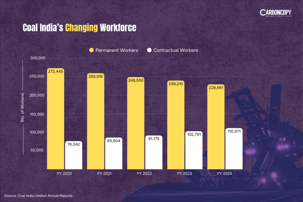 The Coal Ministry has also leased abandoned, underground coal mines to private players as CarbonCopy reported previously. While there are benefits like technological advancement, energy security, and reduction in coal imports, less number of permanent jobs in Coal India means more workers end up as contractual labour.