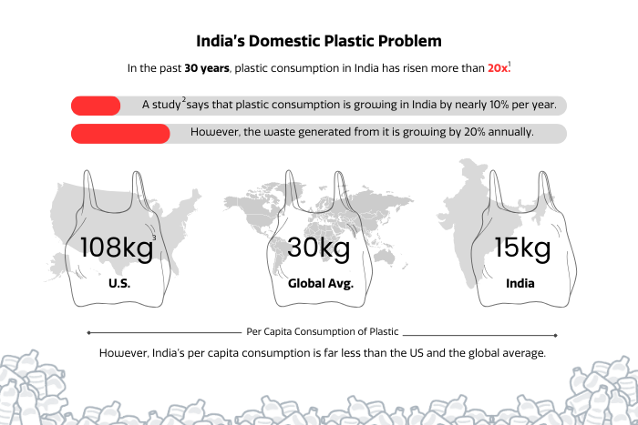 In line with this thinking, India is making efforts on the domestic front by recycling plastic, utilising it in “waste-to-energy” plants, and sending it to incinerators. To reduce the waste, the government announced a prohibition on “identified single use plastic items” in August 2021. This order came into effect in July 2022 under which the government prohibited “identified single use plastic items, which have low utility and high littering potential”, such as earbuds with plastic sticks, plastic sticks for balloons, plastic flags, candy sticks,  and cigarette packets, among others. However, on the ground, this order is rarely implemented and has proven to be largely ineffective.