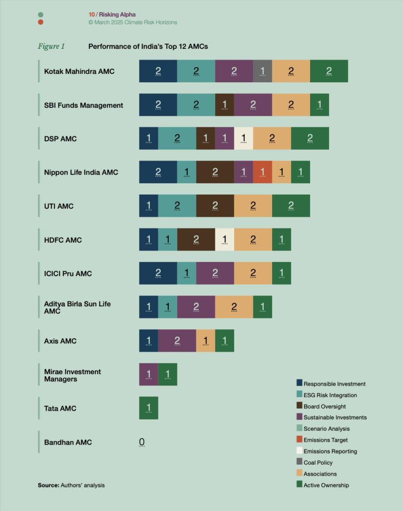 Titled Risking Alpha, the report analyses the climate preparedness of the 12 AMCs whose assets under management exceeded ₹1,00,000 crore consistently through FY 2023–24. The study evaluated the AMCs across ten criteria—including Responsible Investment, Board Oversight, Coal Policies, ESG Integration, Stewardship, and Net Zero Targets.