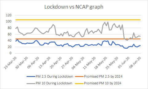 The above graph is a representation of how air quality (PM2.5 and PM10) changed during the lockdown while comparing the prescribed or promised concentration for PM2.5 and PM10 reduction as sought by NCAP.