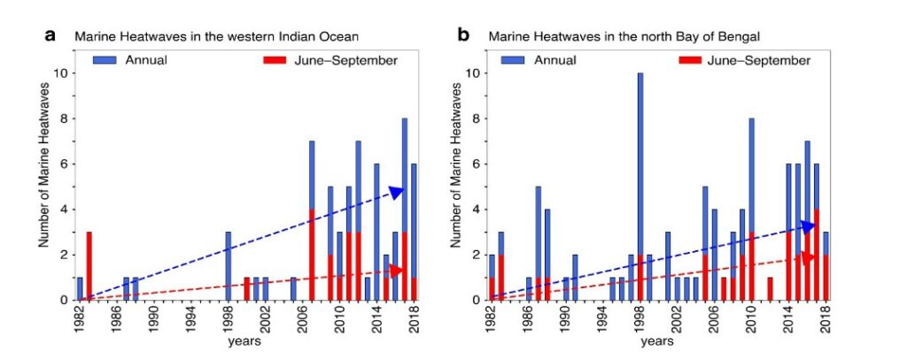 A total of 107 MHW events were identified in this 30-year time span and an increasing trend of 1.11 MHW events/decade was observed. Worryingly though, the paper highlights a stark increase in the frequency of MHWs in the BoB over the past decade. Authors note that if current trends persist, “the BoB will experience heatwaves every month in the next 55–60 years, and it will attain a semi-permanent heatwave state by the end of the century, with extreme temperatures present for more than half of the year.” Interestingly, the paper also shows that while climatic variations like the El Nino Southern Oscillation (ENSO) and the Indian Ocean Dipole (IOD) have a positive correlation with the occurrence of MHWs, the effect of background warming of oceans as a result of global warming has become the dominant factor in the temperature spikes and sustained MHW events.