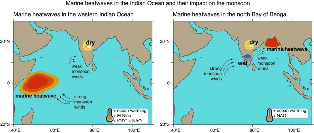 There is now evidence that the implications of the rising trend of MHWs cannot be seen in isolation to other atmospheric and oceanic circulations that are vital to the subcontinent. Enter the monsoon. The IITM study from early 2022 for the first time elaborated on this impact. “The marine heatwaves in the western Indian Ocean and the Bay of Bengal are found to result in drying conditions over the central Indian subcontinent. At the same time, there is a significant increase in the rainfall over south peninsular India in response to the heatwaves in the north Bay of Bengal. These changes are in response to the modulation of the monsoon winds by the heatwaves,” the study states.