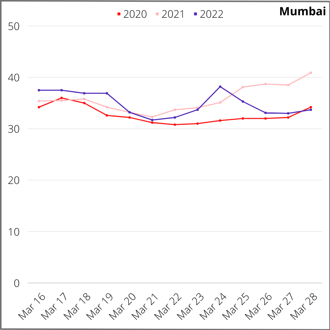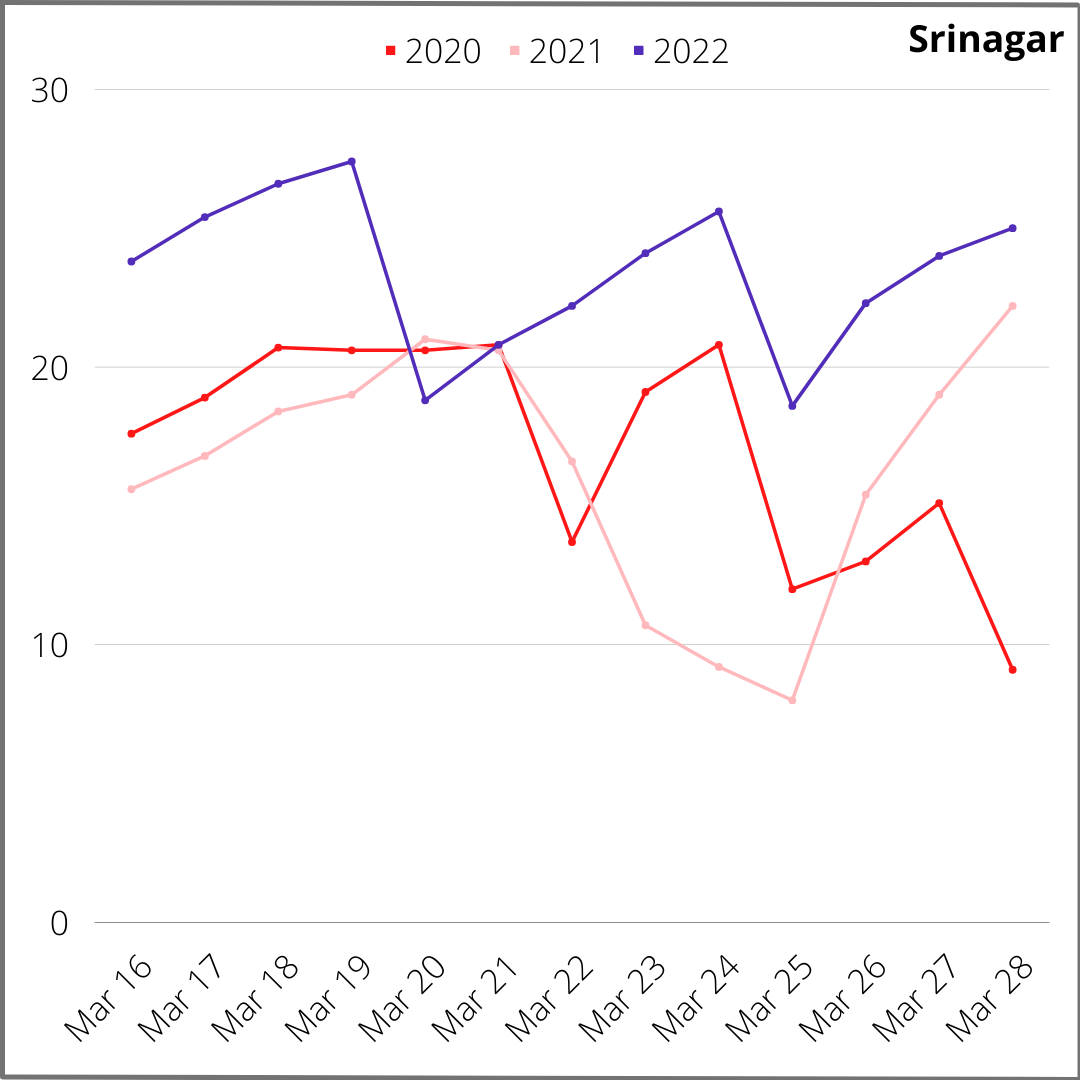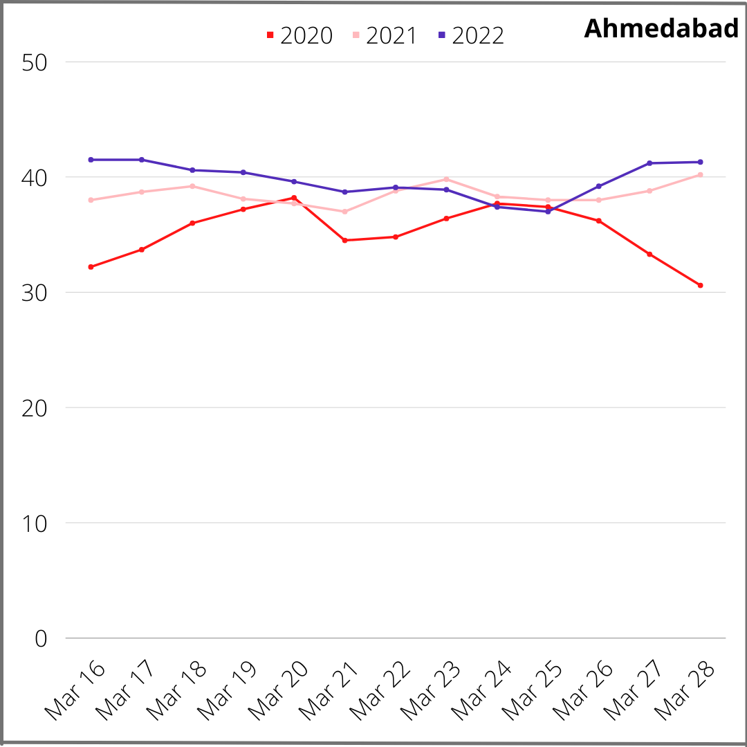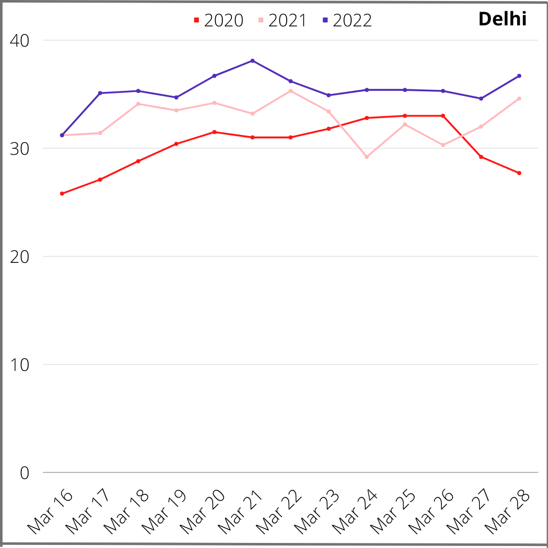 The graphs represent the year-on-year increasing temperatures for three years in four Indian cities. Data courtesy: Ogimet