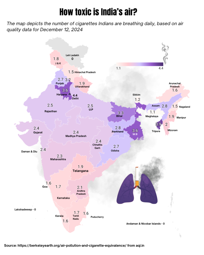 This year, pollution levels in Delhi peaked twice – first was just after Diwali, and the second time was during mid-November, when there was a sudden cold wave in Delhi and the AQI hit 1,600 — which is equivalent to smoking 77 cigarettes in one day, according to an AQI calculator based on a report published in Berkeley Earth.