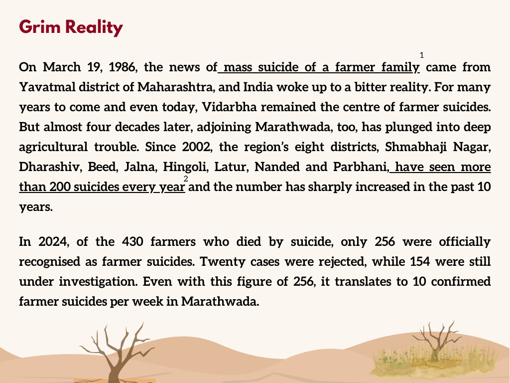 The situation, particularly in Beed district, reflects a deep agrarian crisis, exacerbated by climate change, economic hardships, and unsustainable agricultural practices.