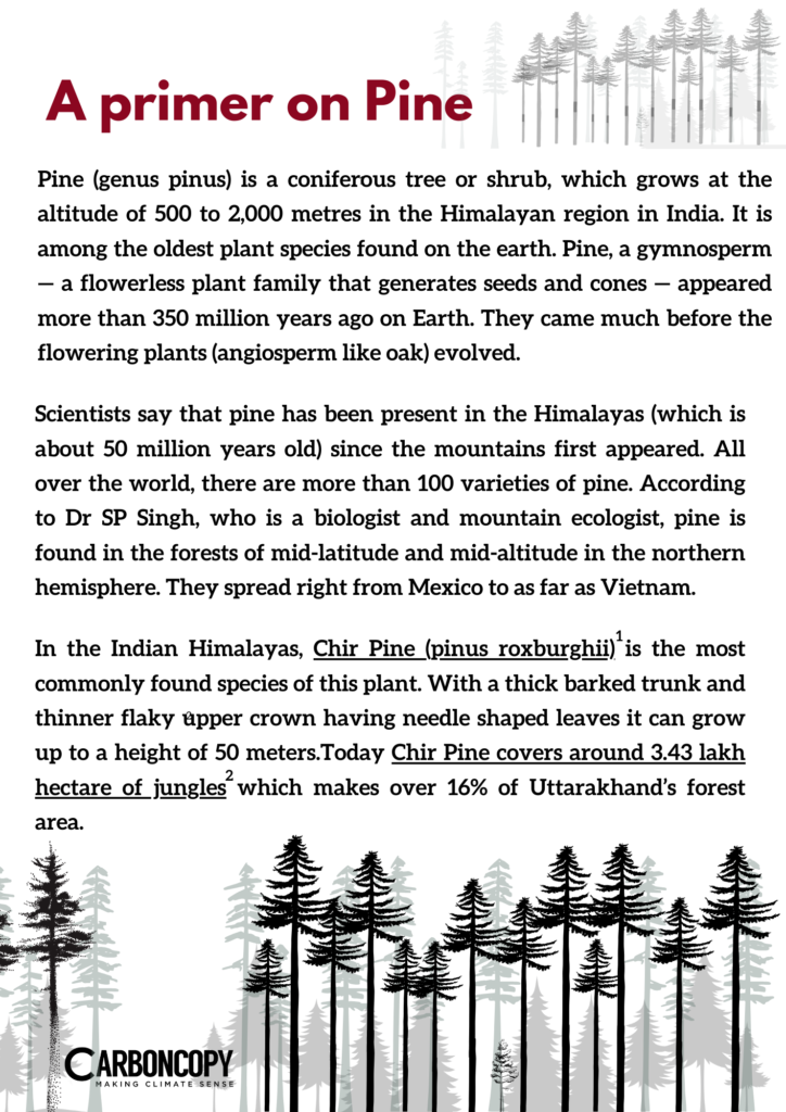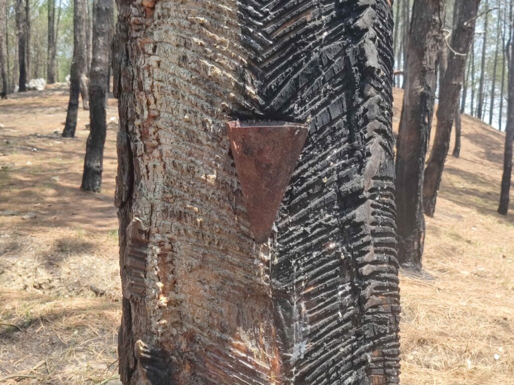 Pine is a native tree species of India. Contrary to popular belief, it was not introduced by the British, but over the decades it received favourable conditions to grow and dominate in the mountainous landscape. Today, there are as many as 8 native and 21 exotic species of pine in India. It was always beneficial for the government to grow pine for its resin, which is used in turpentine oil, soap, paper, paint and chemical industry. It has been an important revenue-earning source for the government since the colonial period. Even now, the Uttarakhand government earns around ₹200 crore annually from the resin.