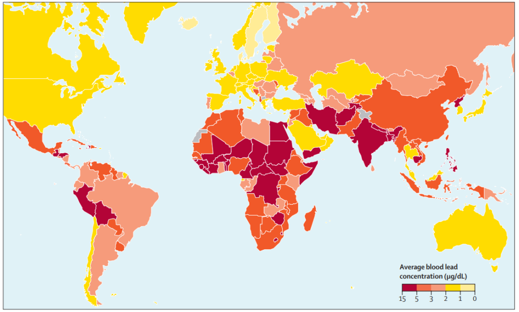 Global distribution of childhood lead exposures in 2019 Childhood lead exposures represented by average blood lead concentration (µg/dL). Source: The Lancet Planetary Health