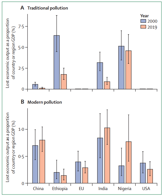 Lost economic output as a proportion of country GDP due to deaths from modern and traditional pollution in 2000 and 2019. Source: The Lancet Planetary Health