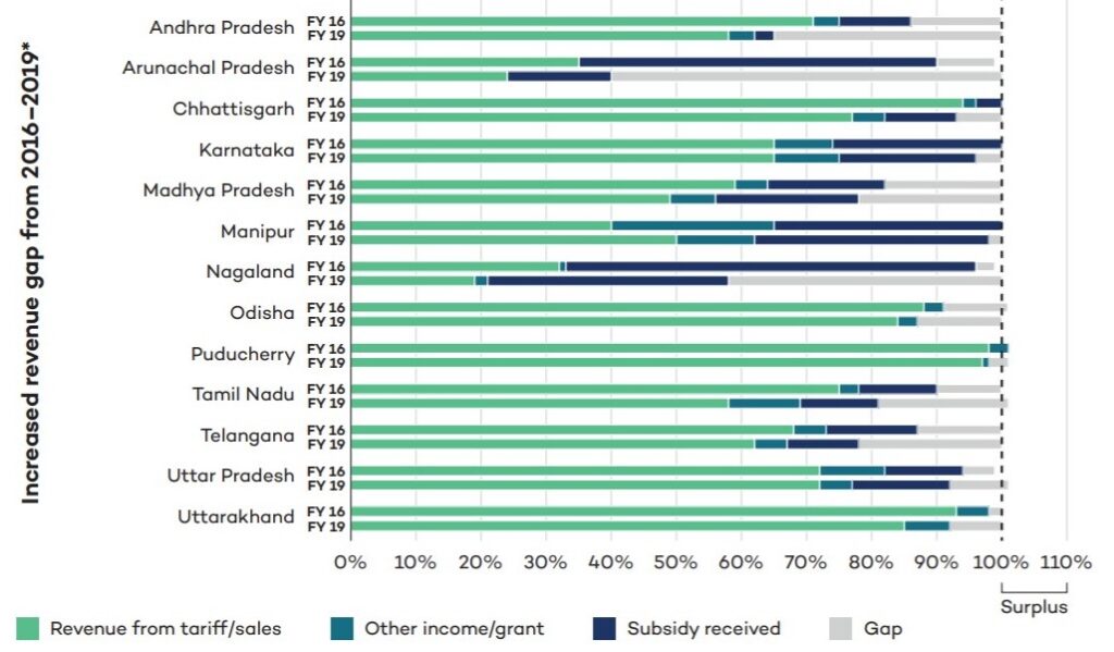 States where the revenue gap has increased since 2016, despite, in some cases, revenue from sales showing an uptick |Source: CEEW-IISD Unpacking India’s Electricity Subsidies