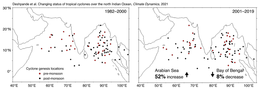 The report ‘Changing status of tropical cyclones in the north Indian Ocean’ mentioned how the frequency, duration, and intensity of cyclones in the Arabian Sea have increased significantly. The intensity of cyclones also has increased in the Arabian Sea by about 20% (post-monsoon) to 40% (pre-monsoon). There has been a 52% increase in the number of cyclones in the Arabian Sea, while very severe cyclones have increased by 150%.