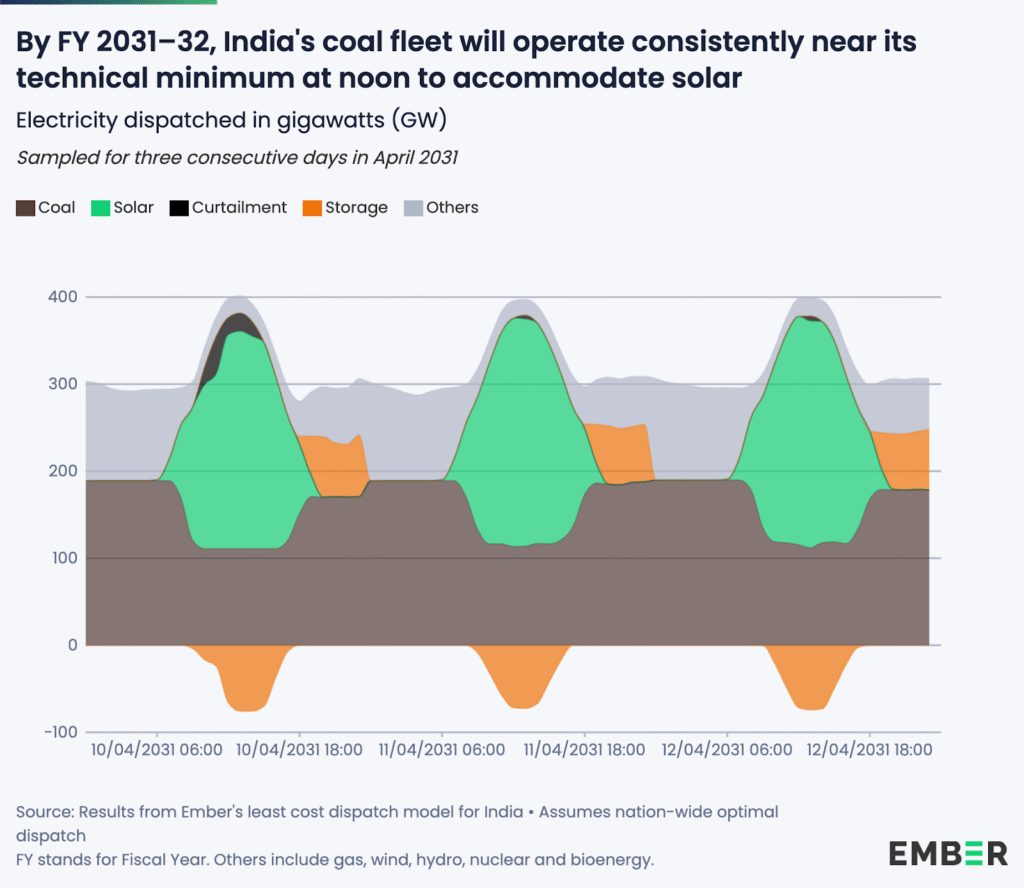 Coal plants have historically been designed and deployed for steady-state ‘baseload’ operations. But as RE’s share increases in the energy pie, coal would need to move more in rhythm with renewables. Thermal power plants would increasingly be required to operate flexibly – ramp down to technical minimum levels during solar hours and ramp up again to meet evening and night demand peaks.