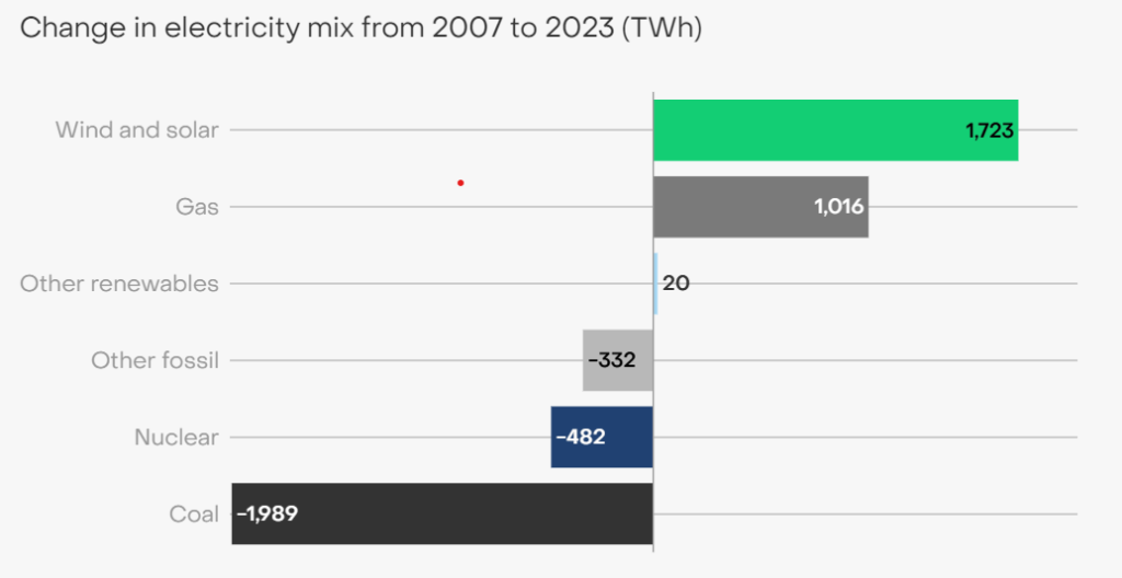 Wind and solar growth was impressive, increasing from 6% to 34% of the UK’s electricity generation in the past 12 years. Combined, the two renewable energy sources grew by 75 TWh, leading to around 28 million tonnes of coal not being burnt, said the report. Economically, this meant saving around £2.9 billion based on 2023 coal prices.